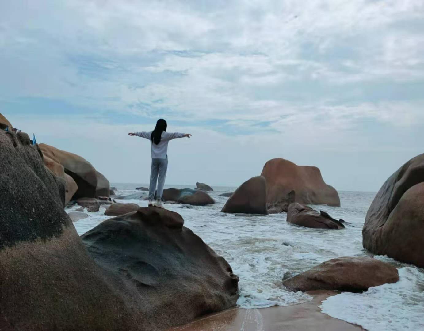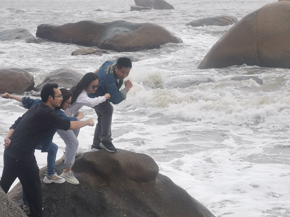 站在那琴半島海邊大家能想到的是什么呢?最多的也獨(dú)屬愛(ài)情了。怪石嶙峋面前便想起宋代文學(xué)家蘇軾的詩(shī)作,“橫看成嶺側(cè)成峰,遠(yuǎn)近高低各不同” 但是在這里我想把它理解得現(xiàn)代一點(diǎn)兒,看到的還是奧斯恩人的團(tuán)結(jié)和關(guān)愛(ài)的同事之情同于家人間的關(guān)愛(ài),天氣似乎有點(diǎn)不配合大家的心情,但這絲毫影響不了大家高漲的情緒,海上有風(fēng),浪花激情得拍打著礁石,遠(yuǎn)看石頭大,近看大石頭;果然石頭大,石頭果然大?!边@是郭沫若當(dāng)年游石林內(nèi)后留容下的一首打油詩(shī)。用在這里也是恰當(dāng)不過(guò)的,為了看得更遠(yuǎn),視野更遼闊,我們陸陸續(xù)續(xù)的開(kāi)始的登上石峰,小姐姐們有些會(huì)有點(diǎn)恐高,但是同事們還是很貼心都會(huì)主動(dòng)互相照顧,就這樣大家的相互幫助下登上了最高峰。